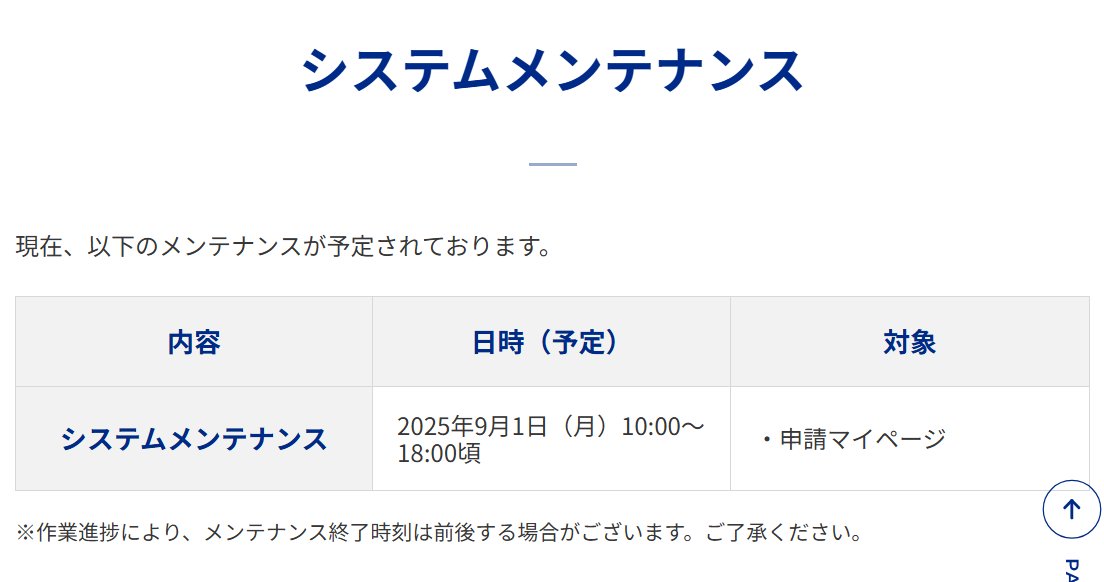 注意!省力化投資補助金システムメンテナンス9月1日(月)10:00~18:00頃ほぼ終日、申請マイページにログインできなくなりますのでご注意ください。