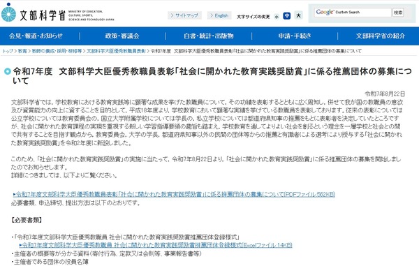 文部科学省は2025年8月22日、2025年度(令和7年度)文部科学大臣優秀教職員表彰「社会に開かれた教育実践奨励賞」に係る推薦団体の募集について発表した。推薦団体の登録はメールで9月19日当日必着分まで受け付ける。
