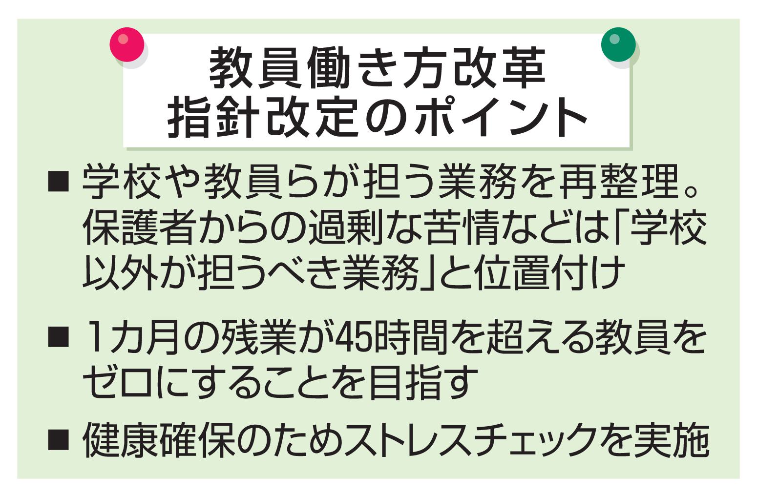 文部科学省は26日、教員の働き方改革を進めるため、業務量の適切な管理に関する指針を改定し、全国の教育委員会に通知した。学校や教員らが担う業務を再整理し、保護者らからの過剰な苦情や不当な要求への対応は「学校以外が担うべき業務」と位置付けた。 1カ月の残業について国が設定する上限の45時間を超える教員をゼロにするとの目標や、健康確保のため心理的負荷を調べる「スト...