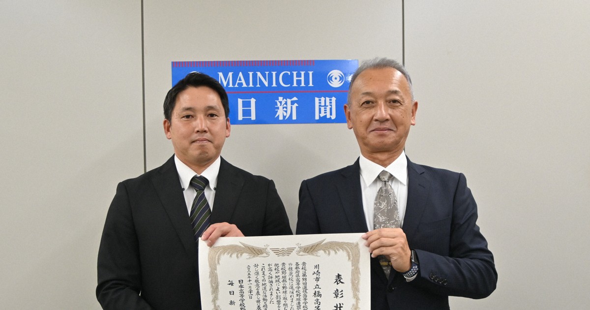 来春の第98回選抜高校野球大会(毎日新聞社、日本高野連主催)で「21世紀枠」の神奈川県推薦校に選ばれた橘(川崎市中原区)の木寺康貴監督らが21日、毎日新聞横浜支局(横浜市中区)を訪れ、坂口裕彦支局長から表彰状を受け取った。