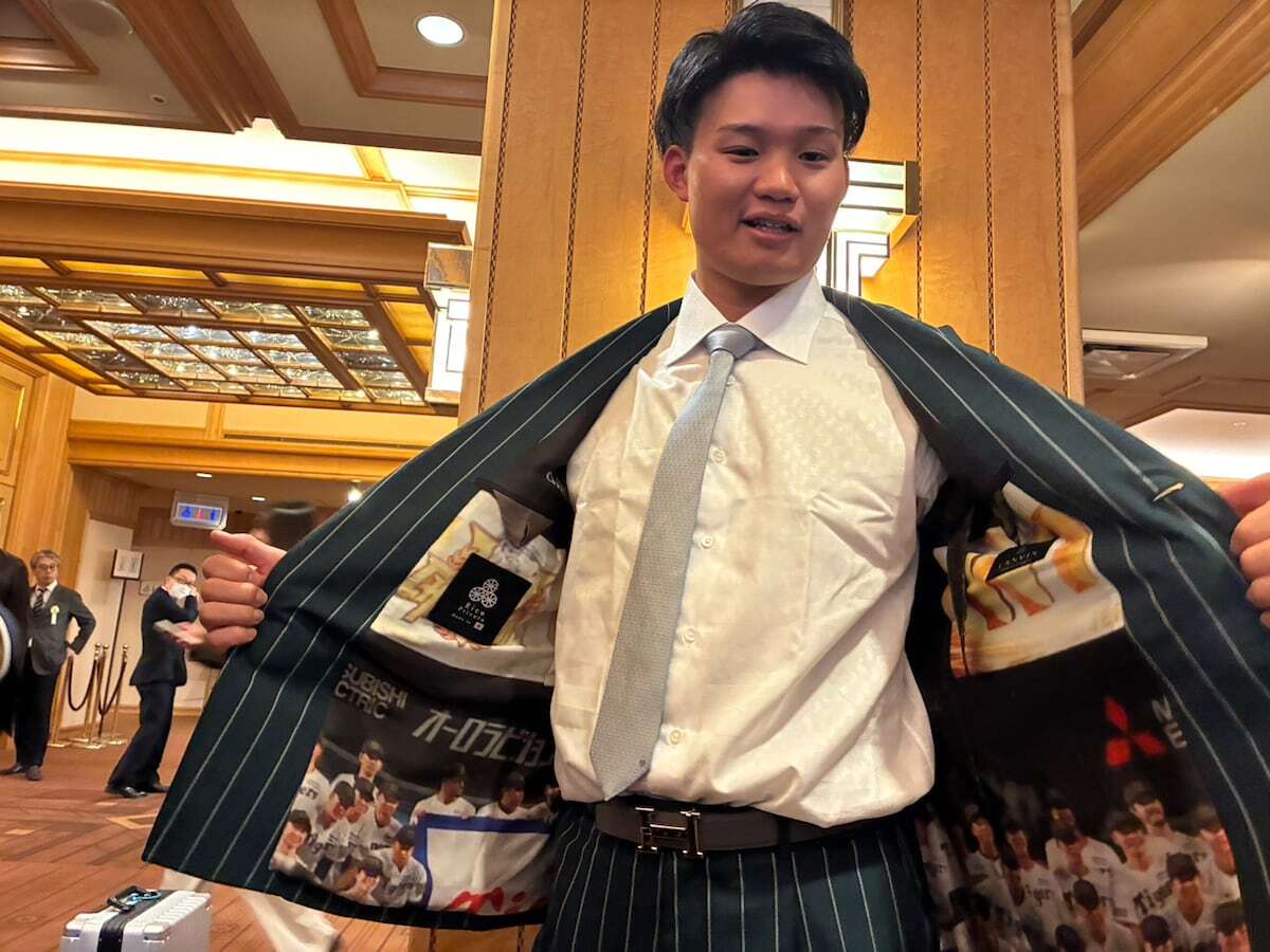 GG賞初受賞の阪神・森下翔太 裏地ド派手スーツで表彰式登場 甲子園写真や V集合写真の …
