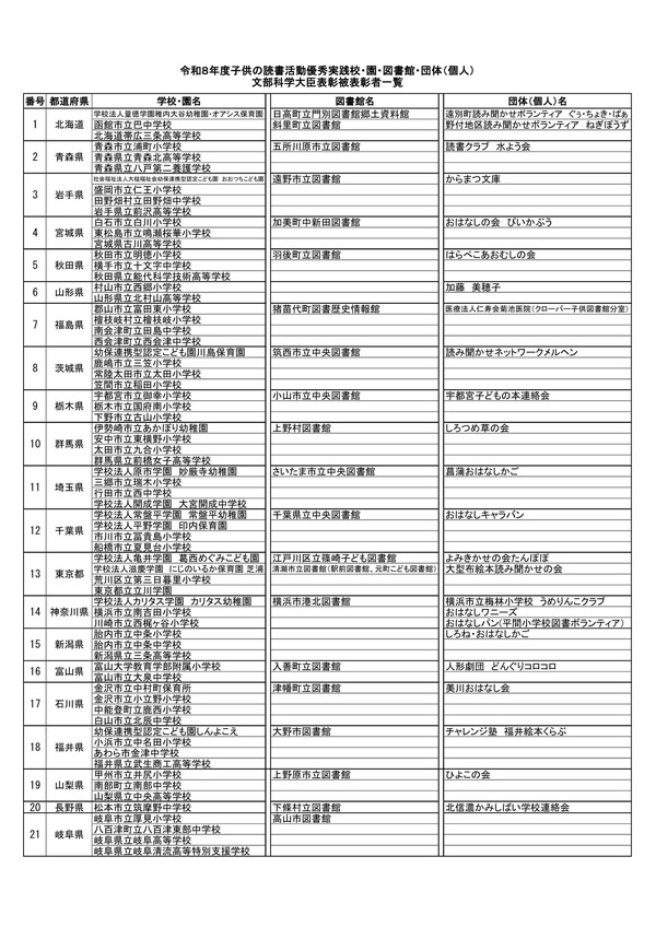 文部科学省は2026年3月17日、子供の読書活動に関する優れた実践を行った学校や図書館、団体を対象に行う文部科学大臣表彰の被表彰者を発表した。4月23日 …