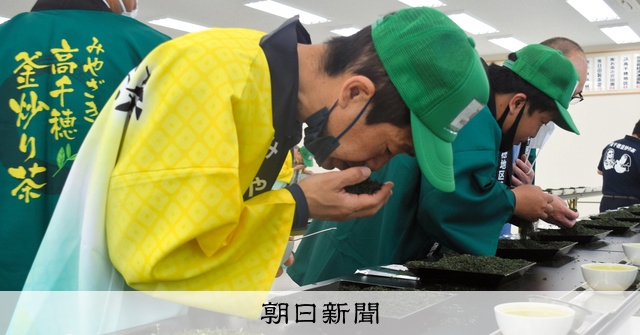 宮崎県北部で生産される「高千穂釜炒(い)り茶」の初入札会が6日、宮崎市内で開かれた。茶商たちが香りや色、お茶の味を確かめた上で応札。