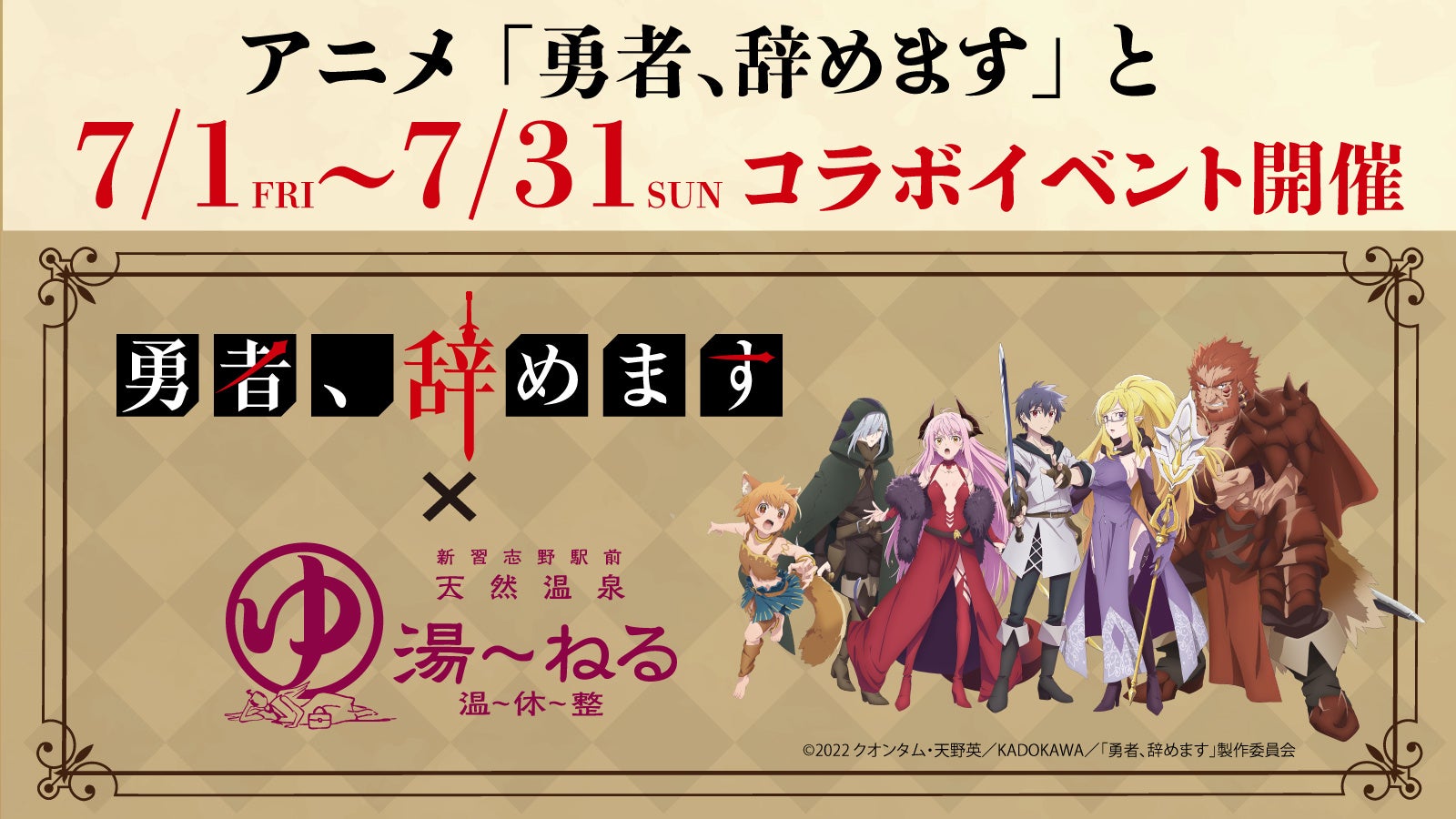 株式会社ヒカリシステムのプレスリリース(2022年6月27日 17時00分)TVアニメ「勇者、辞めます」と天然温泉湯~ねるが7月1日よりコラボイベントを実施!