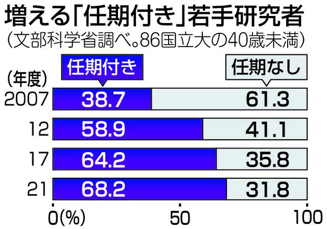 政府が掲げる「科学技術立国の実現」には人材育成が欠かせない。だが、研究者は不安定な立場の「任期付き雇用」が多く、大学で博士課程に進む人...
