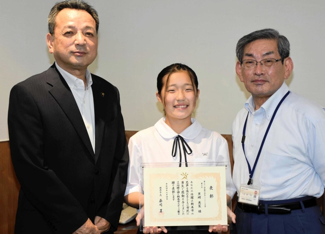 功績者表彰を受けた黒崎美菜さん(中央)ら=朝来市役所. 生野中学校(兵庫県朝来市生野町真弓)1年の黒崎美菜さん(13)が、生野小学校6年時の3月末に …
