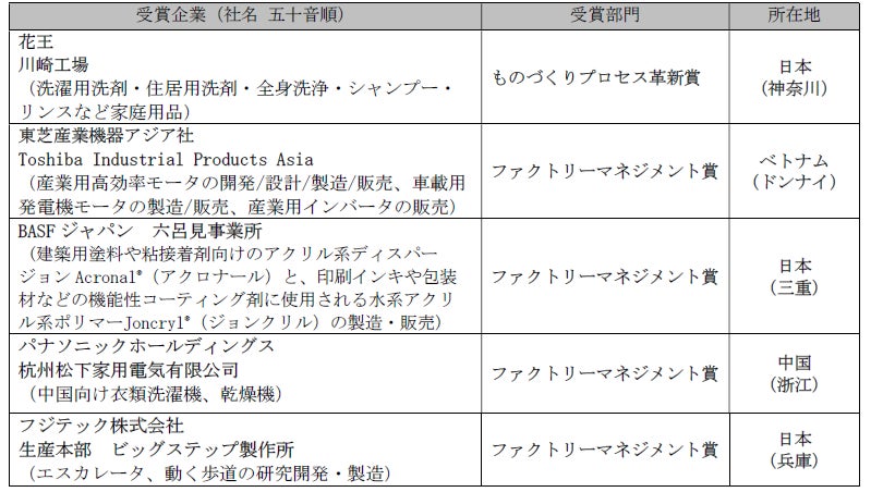 一般社団法人日本能率協会(JMA、会長:中村正己)は、日本およびアジア地域に進出している製造業の生産性や品質の向上、改善活動に成果をあげた工場を表彰 …