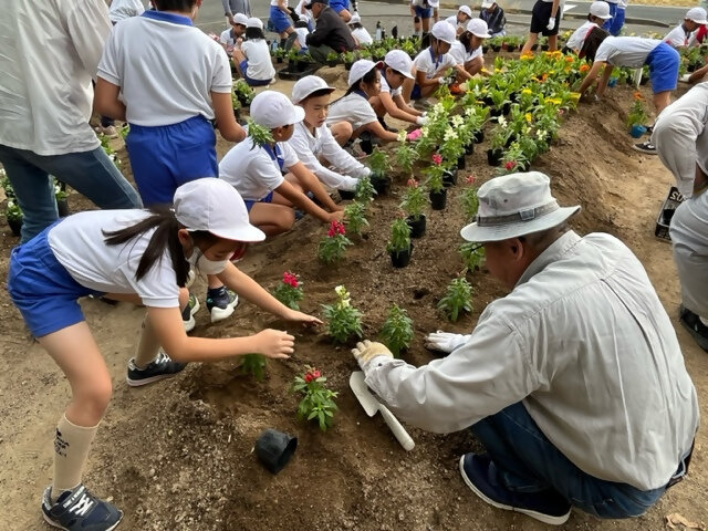10月24日(火)西川副小3年生と自治会長会と老人クラブのみなさんによるボランティア花壇の花植えがありました。 自治会長会の方々が,事前に土作りをして …