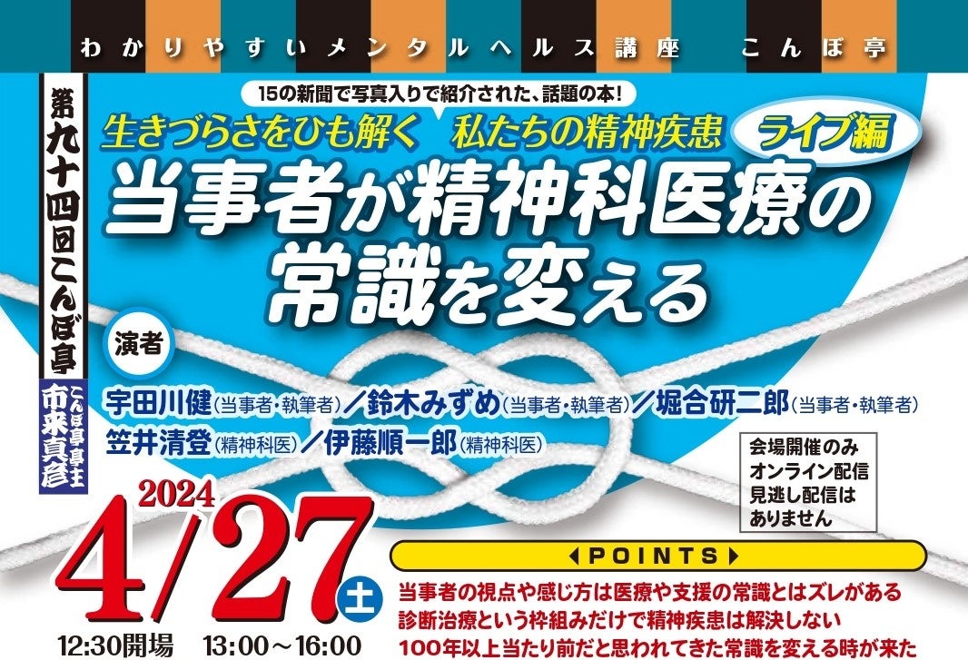 【NPO法⼈地域精神保健福祉機構・コンボ主催】第94回こんぼ亭月例会『当事者が精神科医療の常識を変える』~『生きづらさをひも解く 私たちの精神疾患』ライブ編~