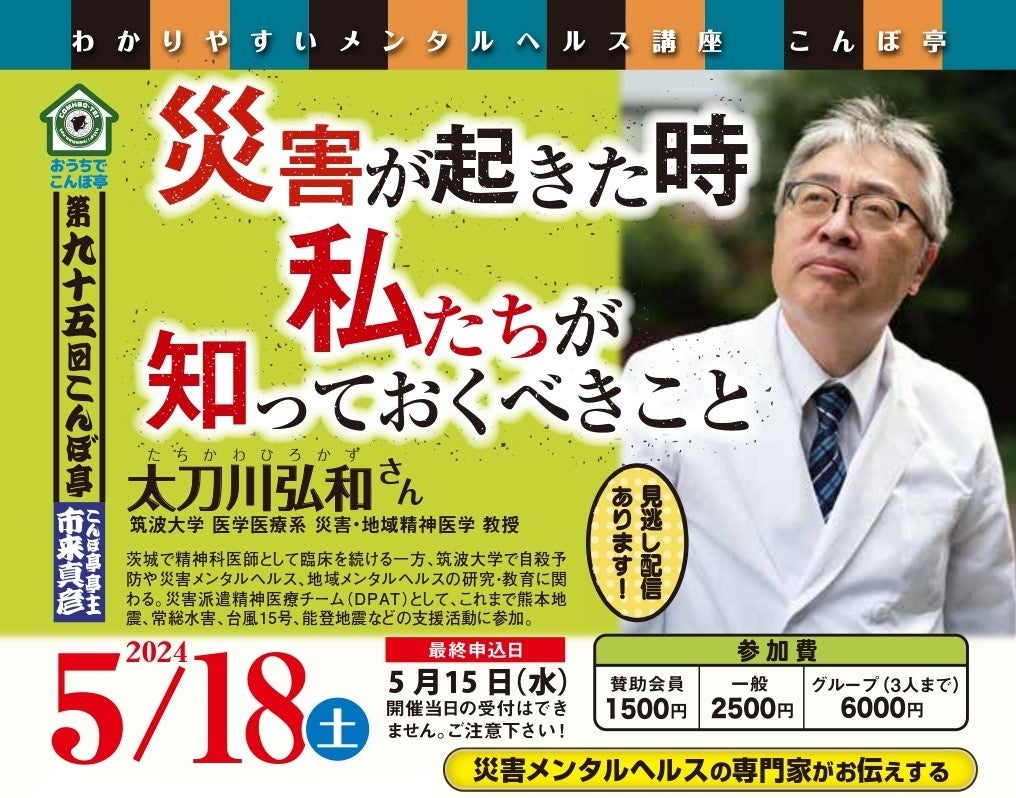 特定非営利活動法人地域精神保健福祉機構のプレスリリース(2024年5月2日 12時50分)【NPO法⼈地域精神保健福祉機構・コンボ主催】第95回こんぼ亭月例会『災害が起きた時、私たちが知っておくべきこと』