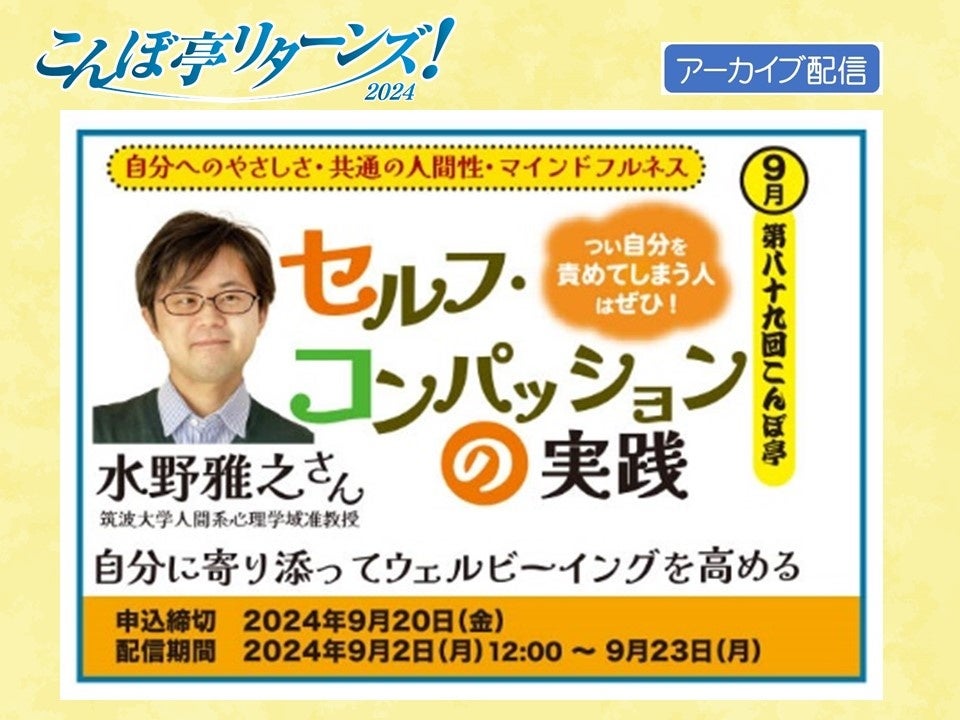 【NPO法⼈地域精神保健福祉機構・コンボ】こんぼ亭リターンズ2024(9月)「セルフ・コンパッションの実践~自分に寄り添ってウェルビーイングを高める~」:9/2より動画配信開始!