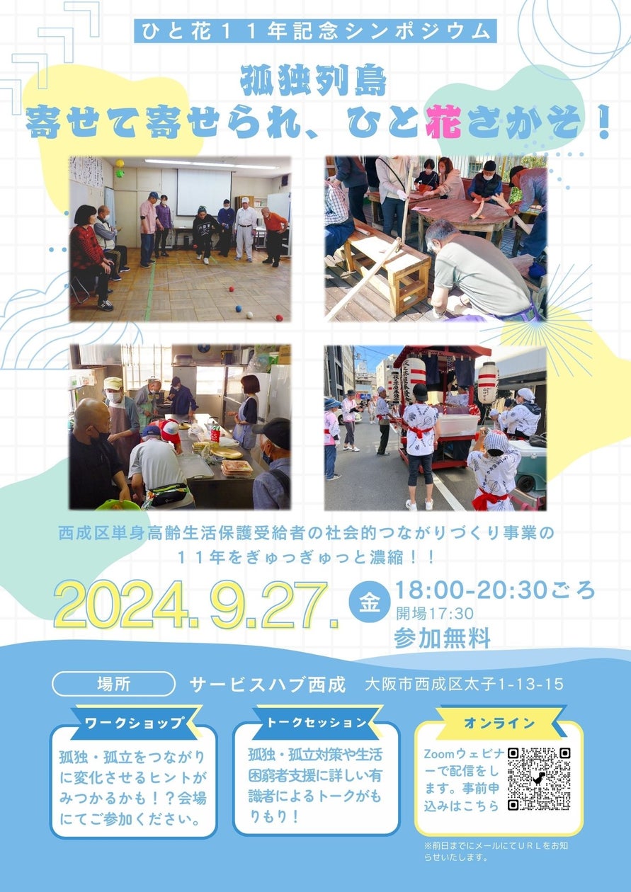 特定非営利活動法人釜ヶ崎支援機構のプレスリリース(2024年9月20日 09時22分)【孤独・孤立対策】ひと花センター11年記念シンポジウムを開催!大阪市西成の釜ヶ崎(あいりん地区)で単身高齢者と共に作ってきた社会的つながりづくり事業の報告イベント