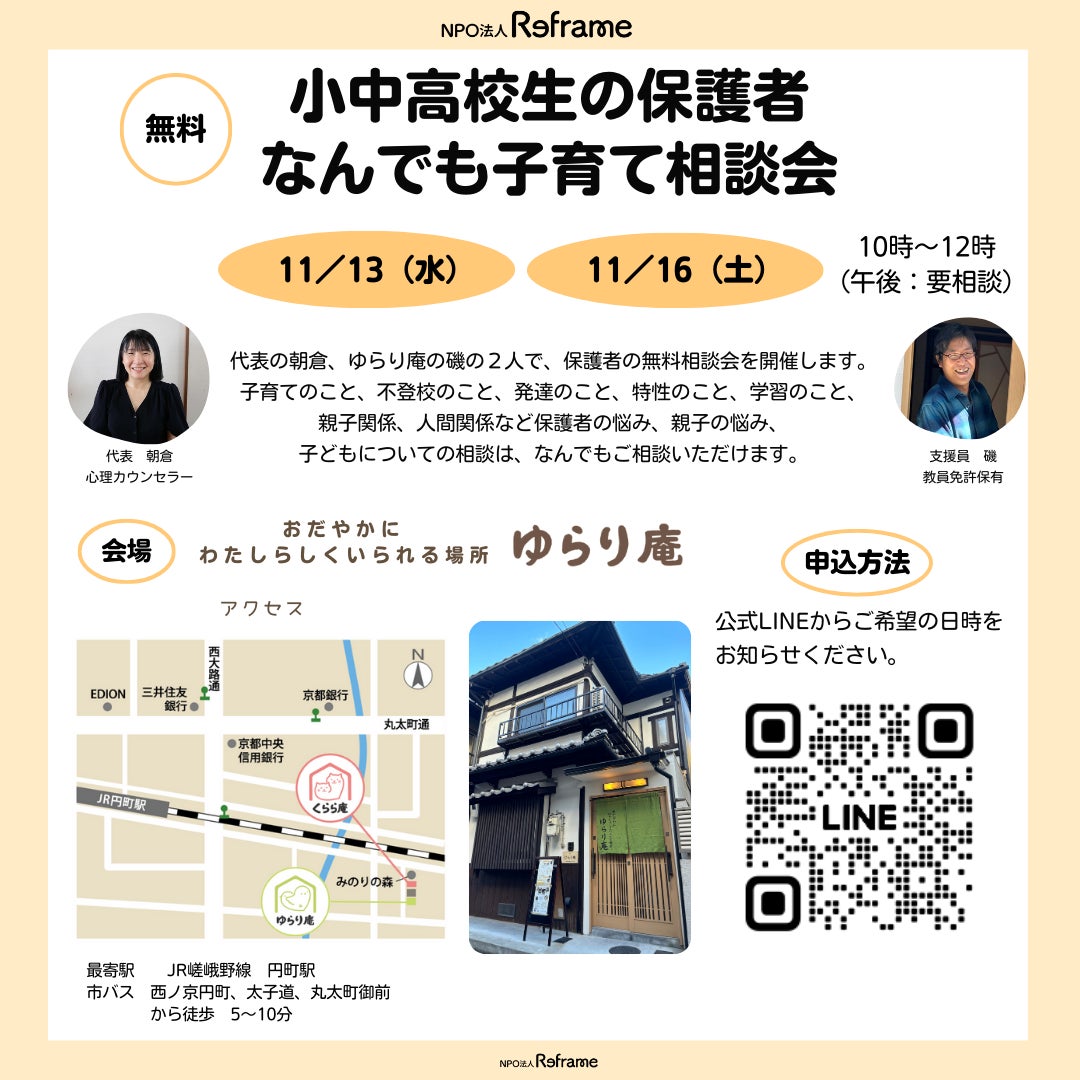 11月13日(水)16日(土)の2日間、不登校支援、子どもの居場所づくりをしているNPO法人Reframeが、小中高校生の保護者対象に、無料で「なんでも育児相談会」を開催!