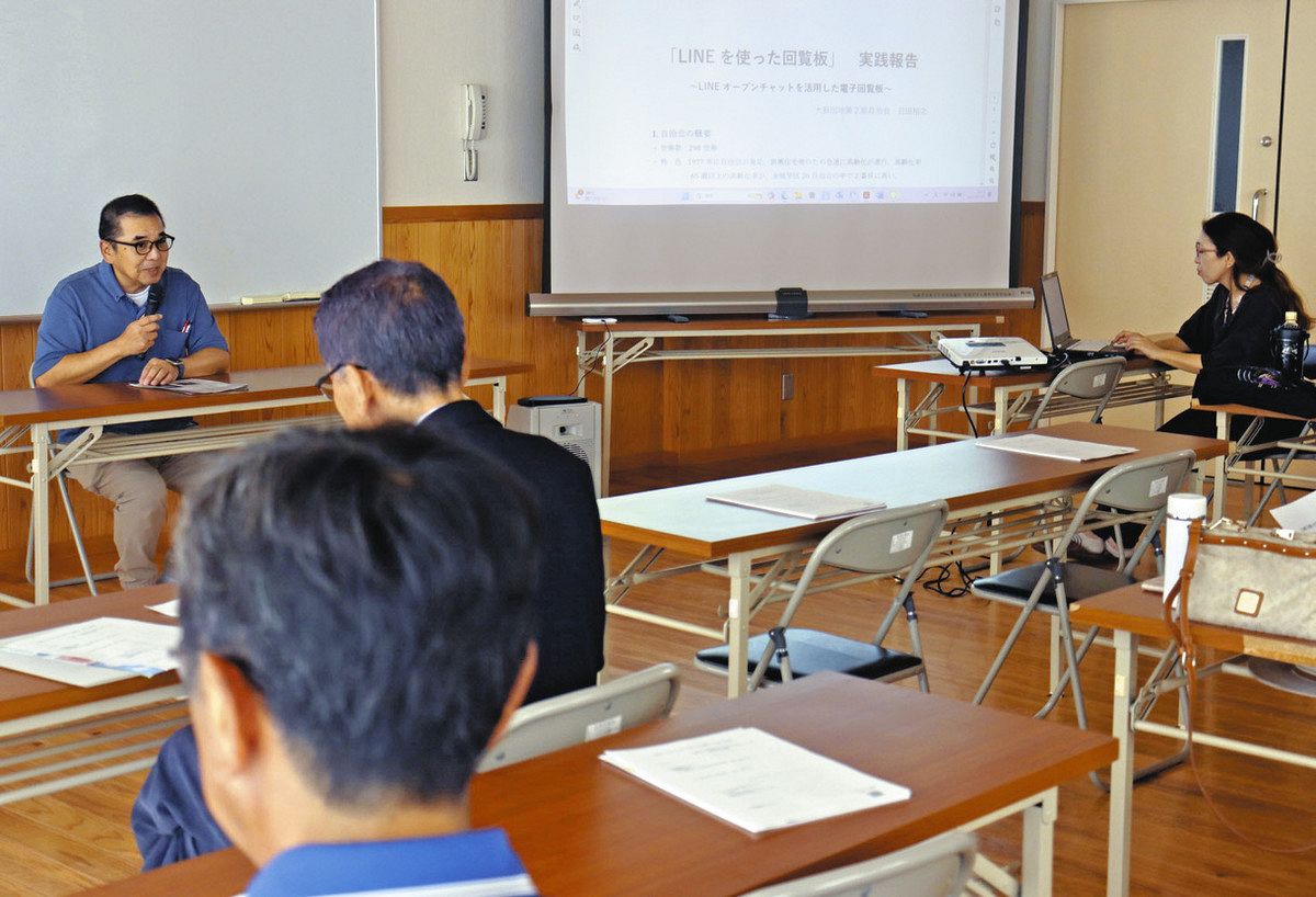 デジタル回覧板を取り入れている市内の2自治会を招いた勉強会が、旭森地区公民館(彦根市正法寺町)で7日にあった。自治会役員や関心を持つ市民約50人が参加。