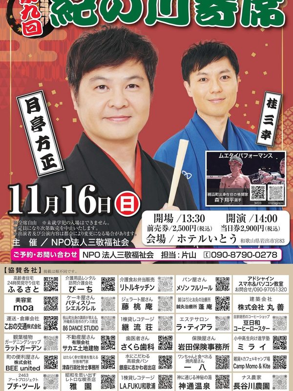 【第9回紀の川寄席】今年で11年目となる「紀の川寄席」をご案内いただいた主催のNPO法人三敬福祉会理事長と麺屋鳥見本岩出店の店長は繋がっていたことが …