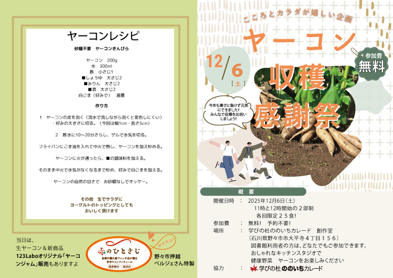 NPO団体123laboの理事としてヤーコンの6次化に取り組んでいます。 毎年、この時期ヤーコン収穫祭と題して、ヤーコンカレーを振る舞います。 限定50食ですが、2回 …