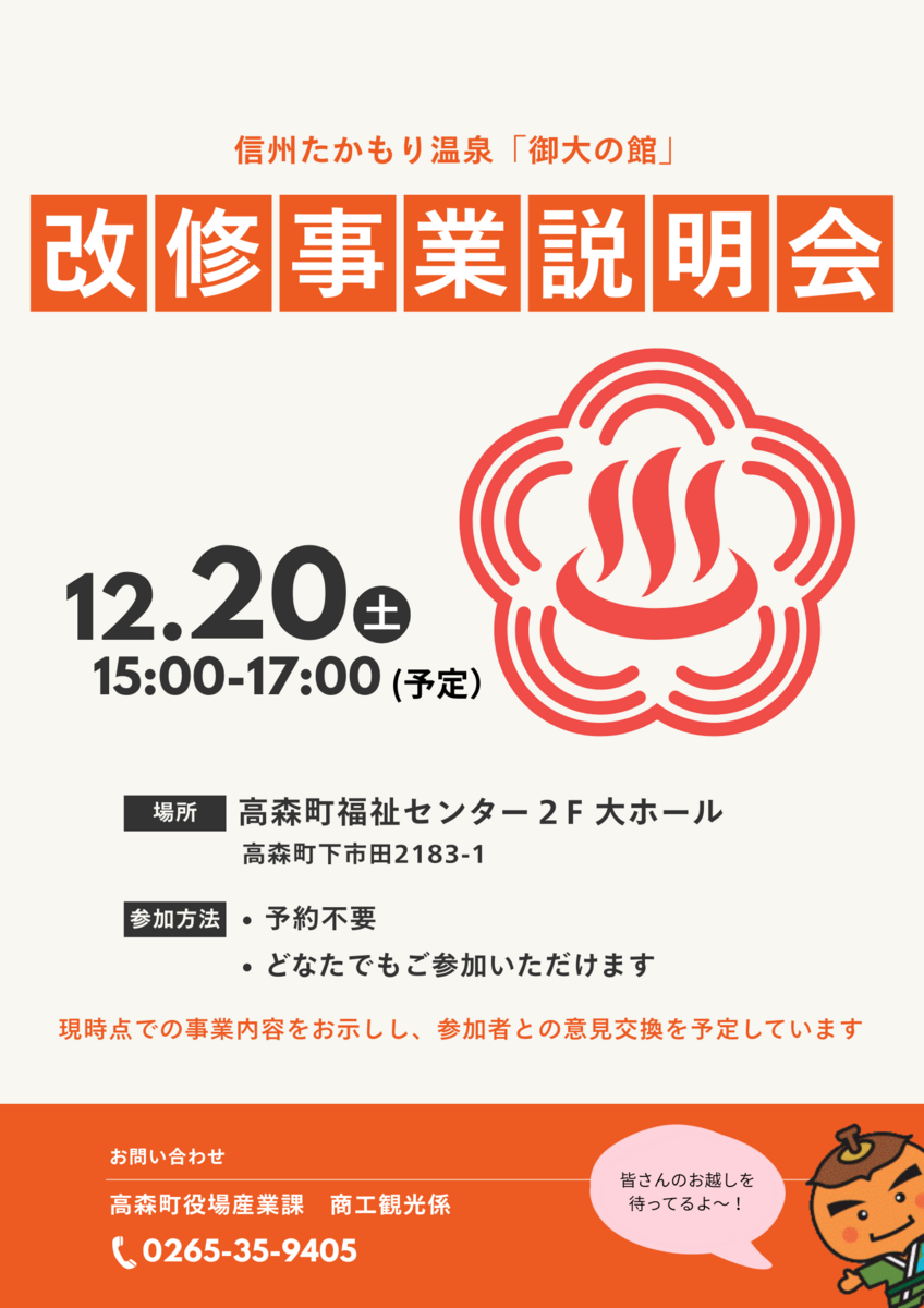 - 信州たかもり温泉「御大の館」改修事業説明会の開催について - 長野県高森町