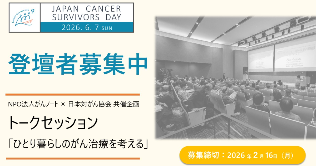 本イベントのプログラムのひとつとして、公益財団法人日本対がん協会×NPO法人がんノートによる共催トークセッション「ひとり暮らしのがん治療を考える(仮題)」を …