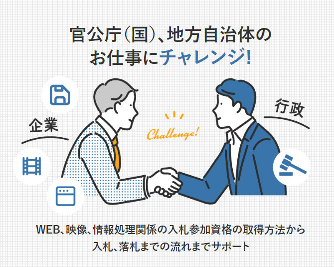 「入札資格取得から入札方法、落札」支援サービスを開始. 年間20兆円を超える巨大市場へアプローチ! 国、自治体と仕事をするための資格からノウハウまでを提供.