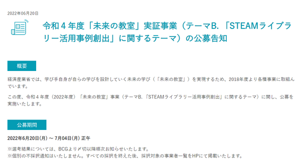経済産業省は2022年6月20日、「未来の教室」実証事業のテーマB「STEAMライブラリー活用事例創出」に関するテーマの公募を開始した。公募期間は、7月4日正午まで。