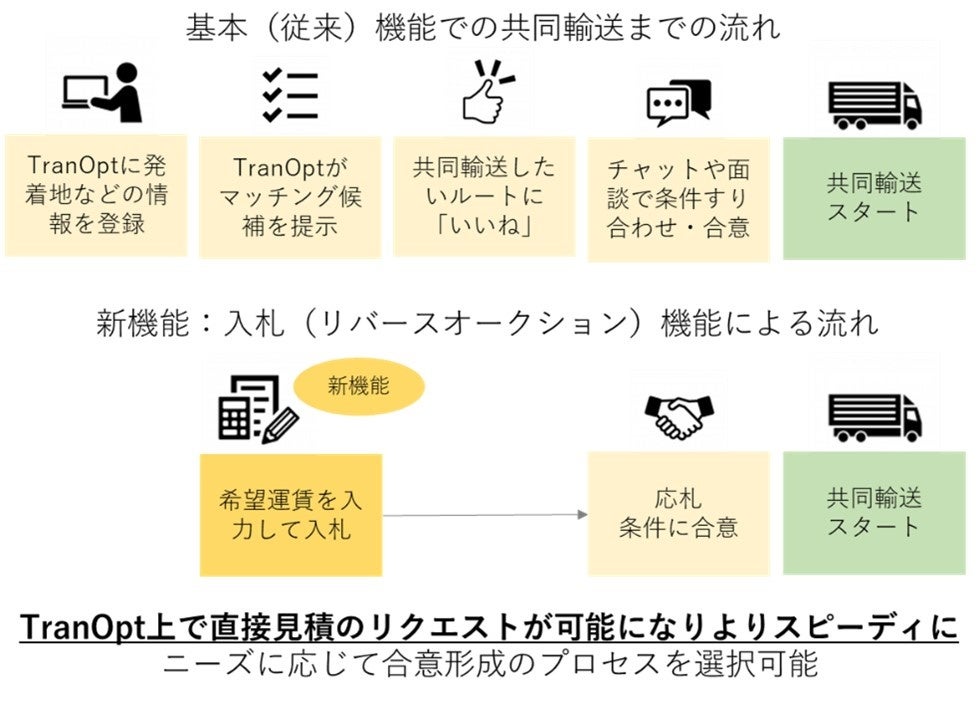 バージョンアップのポイントは、入札(リバースオークション)機能。共同輸送を希望する利用者は、TranOptに希望運賃を入力することで入札を行うことができる。
