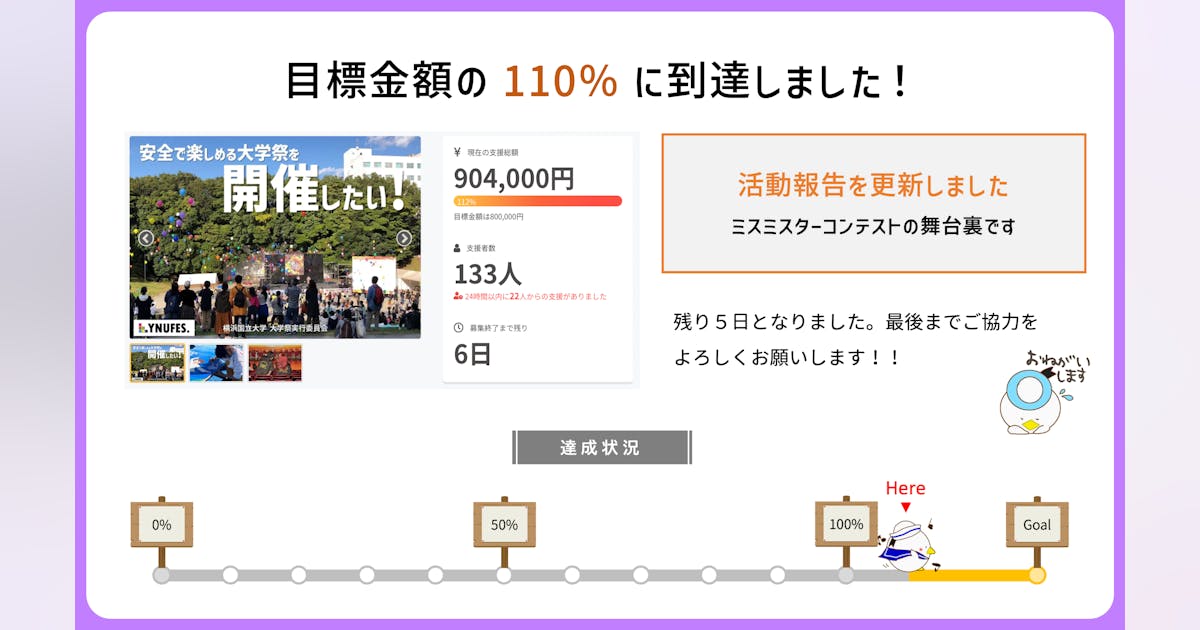 【9/18】目標金額の110%に到達しました! by 【横浜国立大学22常盤祭】3年ぶりの「新しい」大学祭を、安全に楽しんでもらいたい