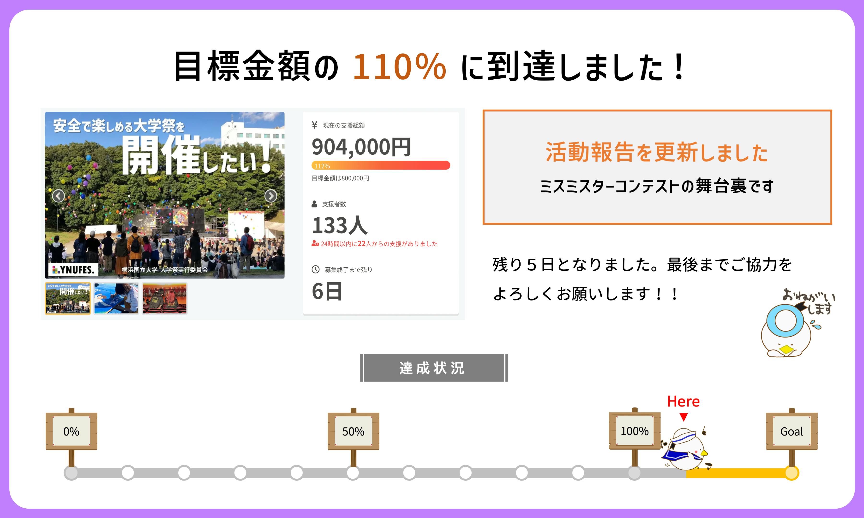 【9/18】目標金額の110%に到達しました! by 【横浜国立大学22常盤祭】3年ぶりの「新しい」大学祭を、安全に楽しんでもらいたい