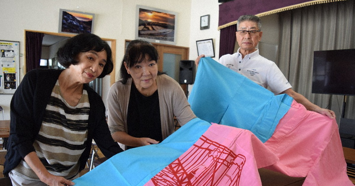 裾に若戸大橋をあしらった浴衣を広げる野田さん(右)ら若松区第10区自治会の役員=北九州市若松区で2022年9月9日午前10時49分、青木絵美撮影.