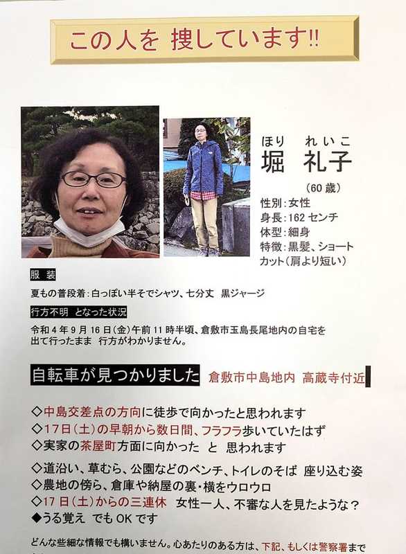 お心当たりのある方は、お近くの警察にご連絡お願いいたします。 #倉敷市 #中島自治会 #玉島長尾 #行方不明 #女性 #堀礼子さん #倉敷市議会議員.