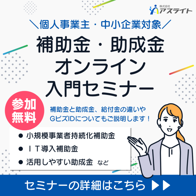 - 使わなきゃ損!!返済不要の補助金・助成金入門セミナー【個人事業主・中小企業対象】