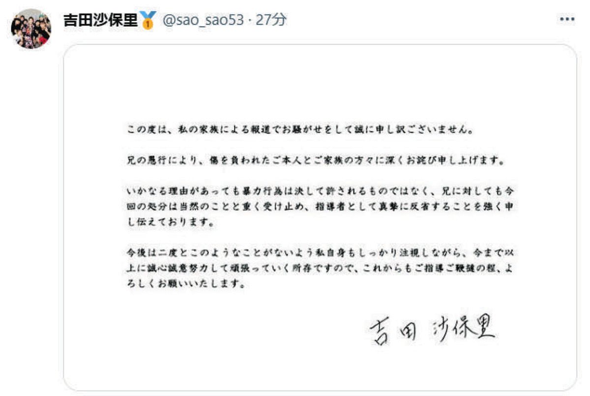 レスリングで五輪3連覇を達成した吉田沙保里さん(41)が30日、兄の栄利さんの不祥事に絡み、X(旧ツイッター)に謝罪文を掲載した。 栄…