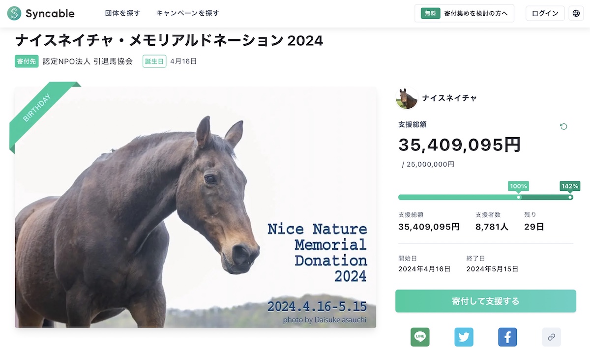 2024年4月16日、NPO法人「引退馬協会」が引退馬支援活動への寄付金を募る「ナイスネイチャ メモリアルドネーション2024」をスタートさせました。