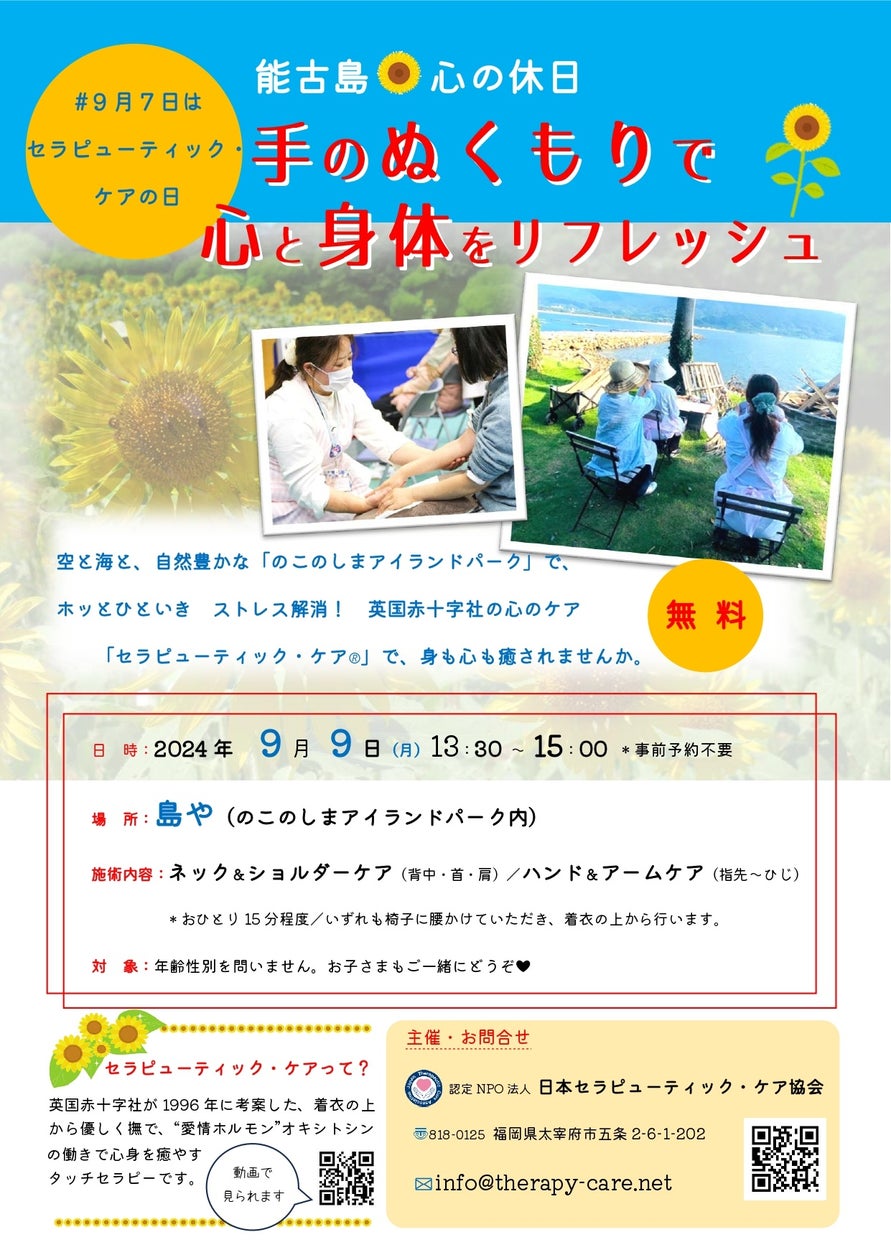 認定NPO法人 日本セラピューティック・ケア協会のプレスリリース(2024年8月28日 16時30分)【初企画】能古島セラピューティック・ケア無料体験イベント.
