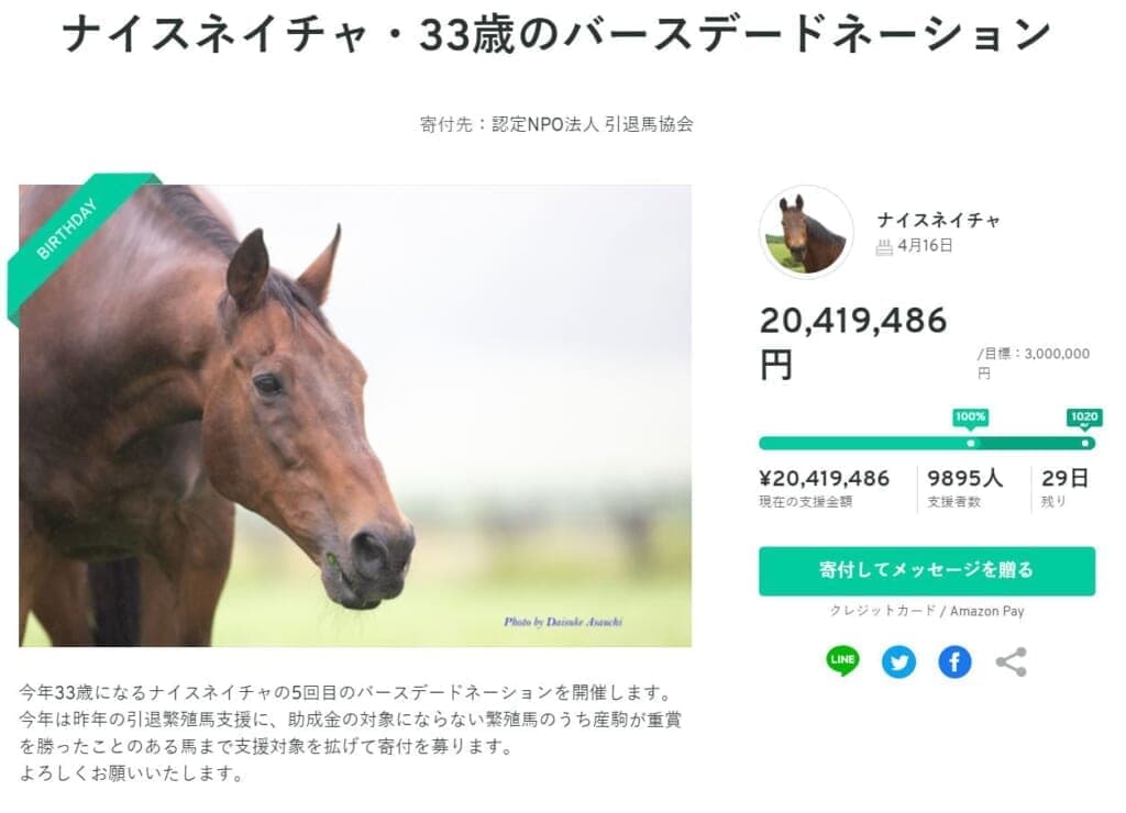 「ナイスネイチャ」33歳の誕生日を記念して引退馬を支援するための寄付金を募集。『ウマ娘』効果か、目標額200万円を速攻で超え、わずか3日で昨年の寄付額の10倍を超える2000万円が集まる