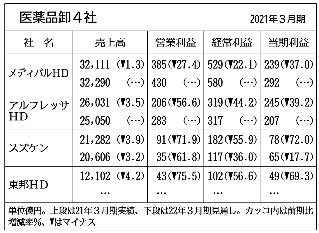 医薬品卸4社の通期見通し、1社営業減益 入札指名停止など響く