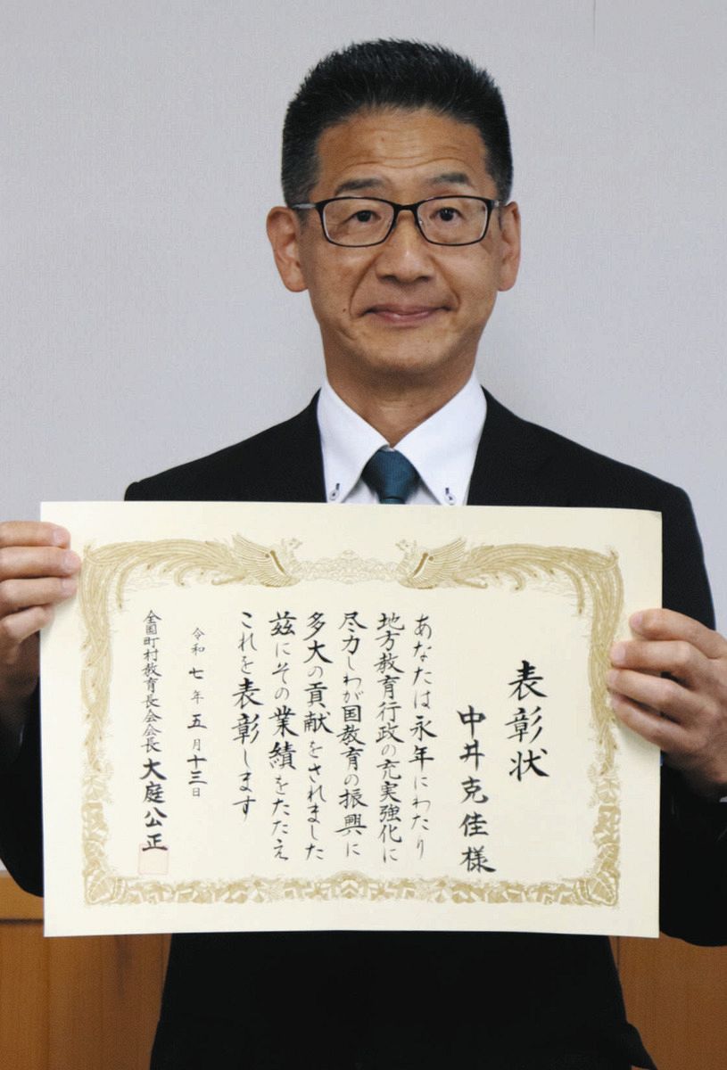紀北町の前教育長、中井克佳さん(66)が全国町村教育長会から教育功労者表彰を受けた。23日に町役場で賞状を受け取り、「教育の充実に理解…