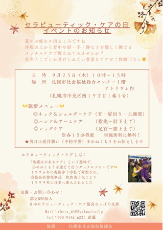 認定NPO法人 日本セラピューティック・ケア協会#9月7日はセラピューティックケアの日このたび認定NPO法人 日本セラピューティック・ケア協会さっぽろ支部では、9月7日の「セラピューティック・ケアの日」を記念し、無料でケアを体験できるイベントを開催いたします。「セラピューティック・ケア(R)」とは1996年に英国赤十字社で考案されたタッチセラピー。洋服の上から、肩や背中、腕などを優しく包み込むように撫で、”愛情ホルモン”オキシトシンの働きにより心身を癒やすケア法です。セラピュ...