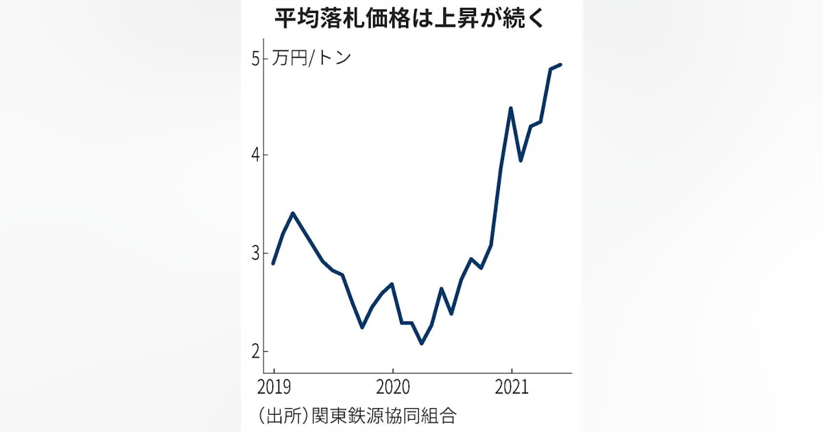 鉄スクラップ事業者でつくる関東鉄源協同組合(東京・品川)が9日に実施した6月契約分の輸出入札の平均落札価格は、1トンあたり4万9195円と前月 …