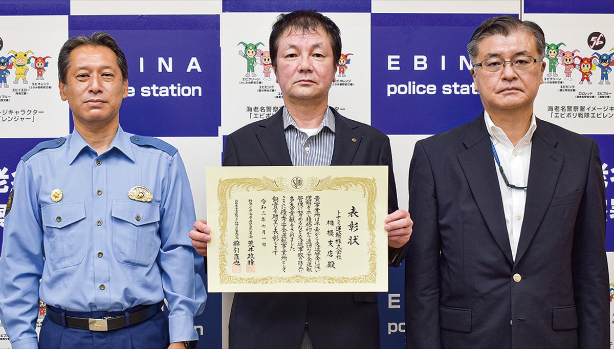 … 旭区、綿引直也所長)と海老名警察署(荒井政晴署長)が9日、交通事故防止に貢献したとしてトナミ運輸株式会社相模支店(海老名市上郷)を表彰した。