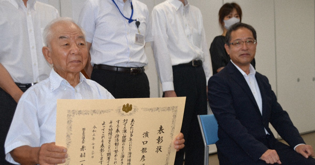 海岸清掃を44年間続ける佐賀県唐津市呼子町の浜口龍彦さん(85)が2021年の「海の日」海事功労者で最高位の国土交通大臣表彰を受けた。28日、 …