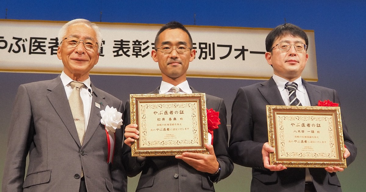 へき地医療に尽力する医師の功績をたたえる「第8回やぶ医者大賞」の表彰式が13日、兵庫県養父市八鹿町のやぶ市民交流広場(YBファブ)ホールで開かれた。滋賀県長浜市の医療法人北海道家庭医療学センター浅井東診療所所長の松井善典さん(41)と、北海道松前町立松前病院院長の八木田一雄さん(50)に賞状と「や