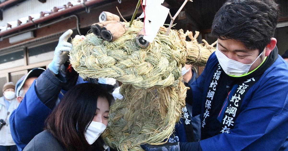 わらで編んだ大蛇、頭をがぶり コロナ終息願い蛇綱 京都 | 毎日新聞