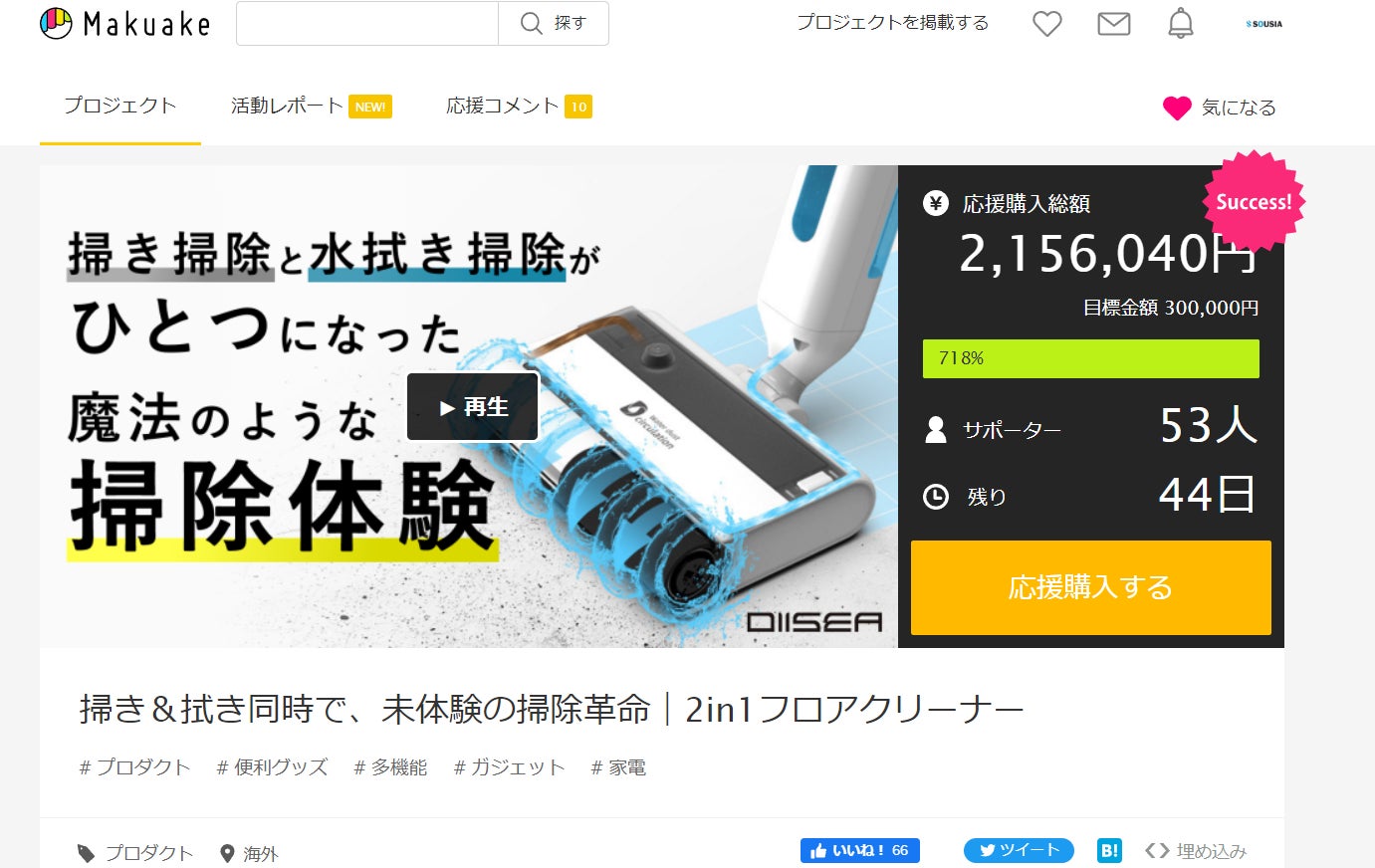【DIISEA フロアクリーナー】で多くの方のお掃除に革命を起こせるよう、引き続き尽力してまいります。 【プロジェクト速報】. ・開始50分で目標金額100%達成! ・ …