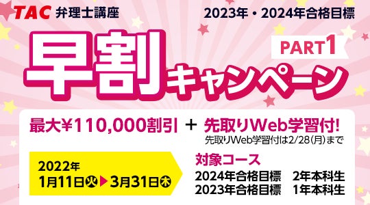 TAC株式会社のプレスリリース(2022年2月8日 16時40分)【2023年・2024年合格目標】 弁理士初学者コース 春の早割キャンペーンを好評実施中