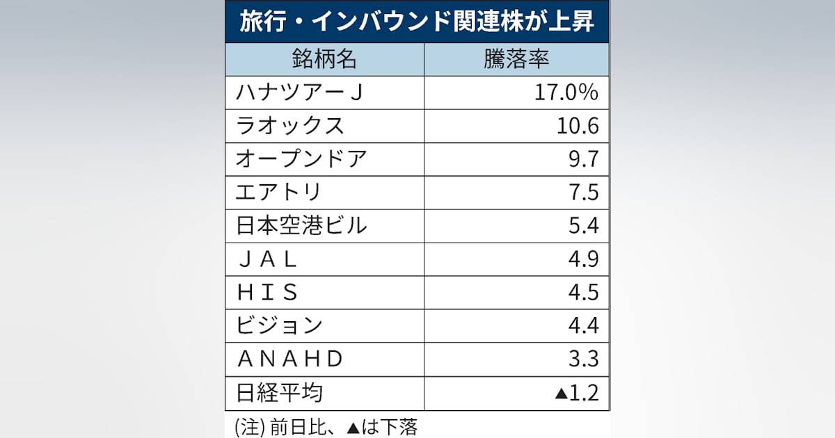 23日の東京株式市場で、旅行やインバウンド(訪日外国人)関連銘柄への買いが目立った。政府は新型コロナウイルスの感染拡大防止の水際対策を緩和する方針だ …