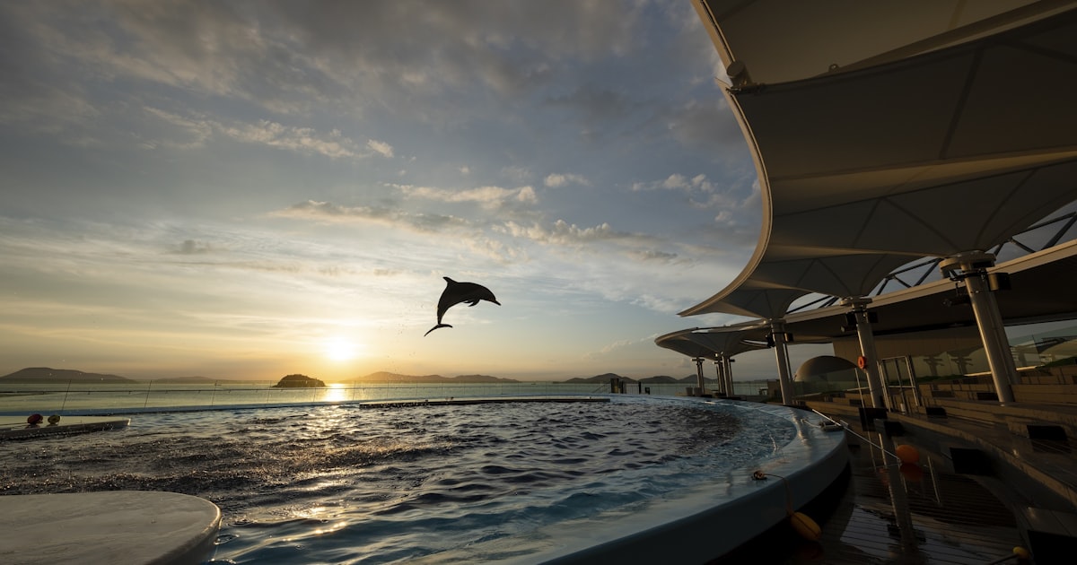 従来は午後6時までだった営業時間を、日没の10分後まで延長した。同館のサンセットデッキでは瀬戸内海が一望でき、イルカが泳ぐ姿とともに沈んでいく夕日を …
