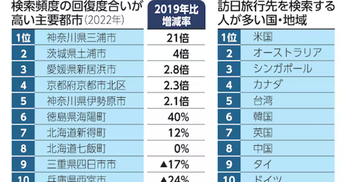 【この記事のポイント】・訪日旅行先の検索数、7市町でコロナ前水準を超す・神奈川県三浦市や茨城県土浦市などに関心・入国制限緩和をにらんだ海外への …