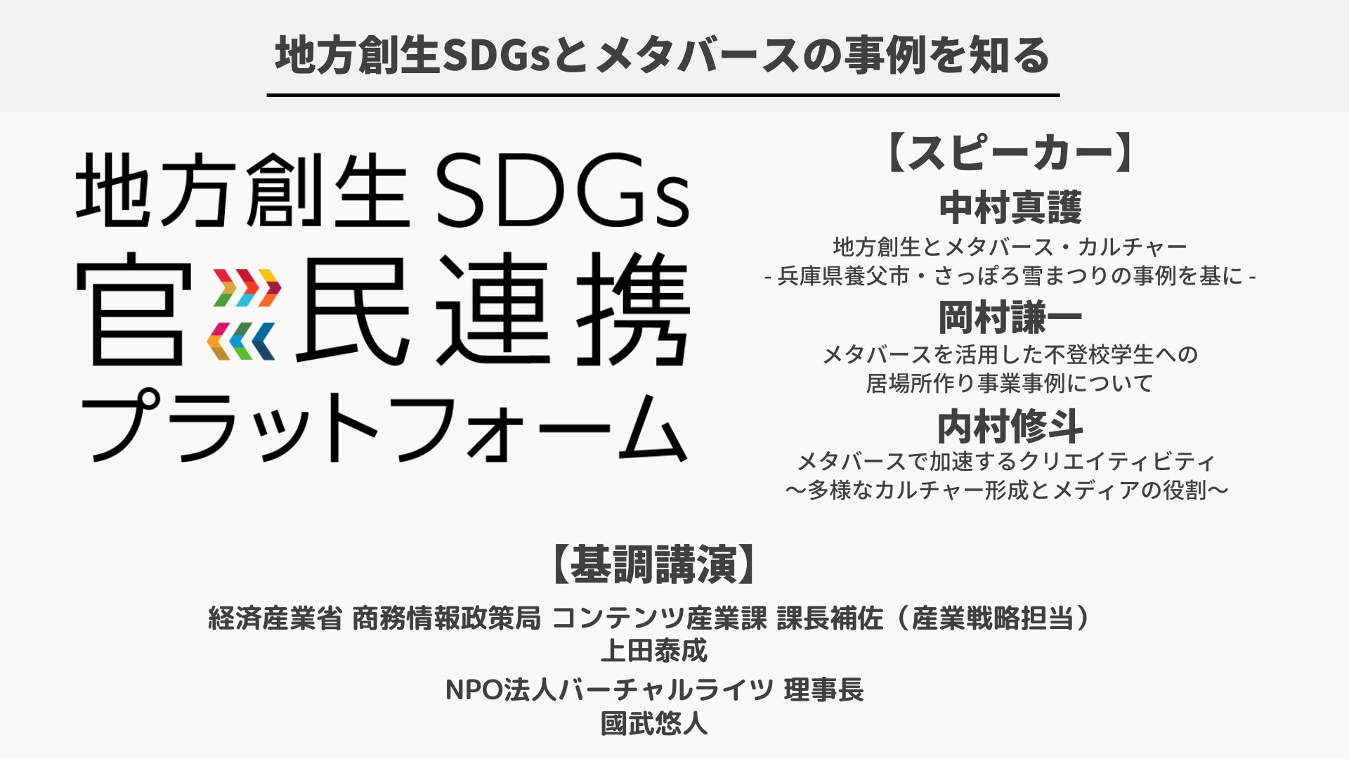 基調講演には経済産業省及びNPO法人バーチャルライツが、講演では3人のメタバースクリエイターが登壇します。 メタバースにおける地方創生とSDGsの事例を最 …