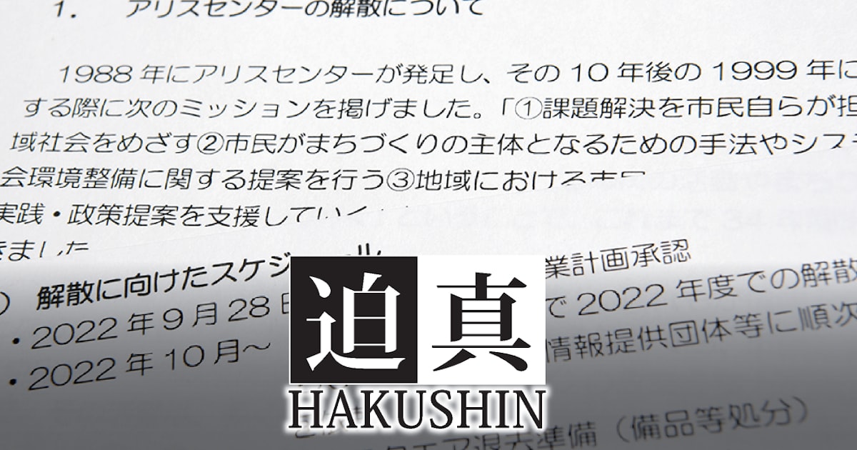 「バトンタッチがかなわず、活動継続が困難なため解散します」。11月、パソコン画面越しに映し出された理事らの顔を前に、NPO法人「まちづくり情報センターかながわ」理事長、川崎あや(60)は法人解散を告げた。事務所の退去、電話解約などを経て34年続いた法人は来年7月をメドに解散する。1988年に発足。神奈川県内で地域の課題やNPOと行政の関係などについて政策提言に取り組んできた。90年代後半には会