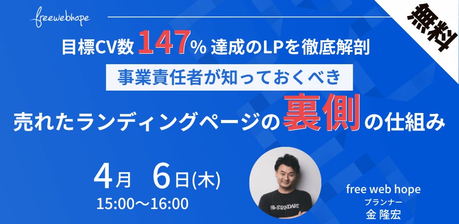 株式会社free web hope(本社:東京都中央区、代表取締役:相原ゆうき)は、無料のオンラインセミナー「目標CV数147%達成のLPを徹底解剖!